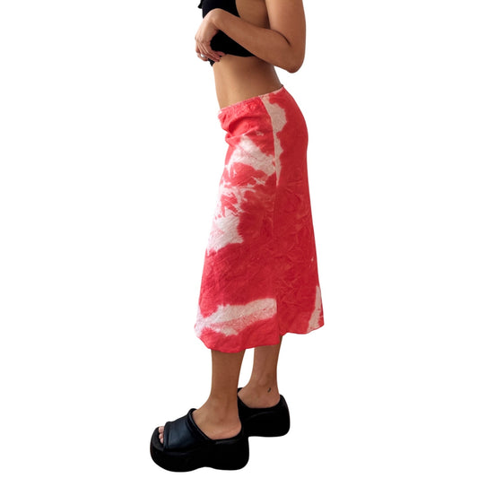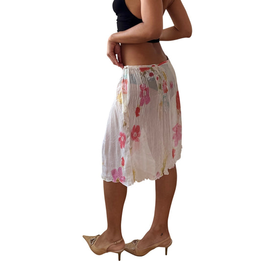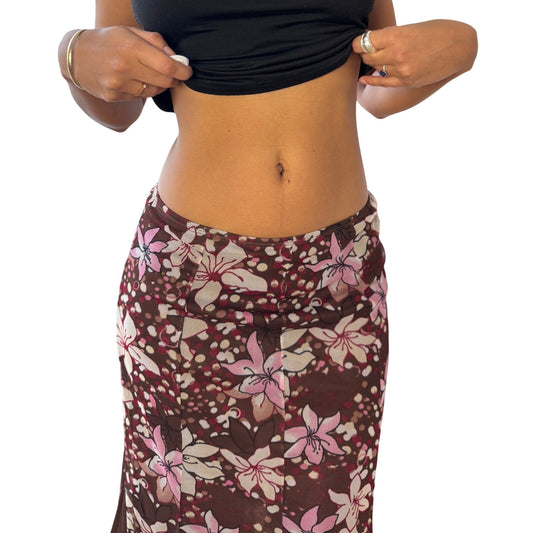 Vintage Italian Brown Floral Mesh Midi Skirt Sheer Ruffle Hem (S)