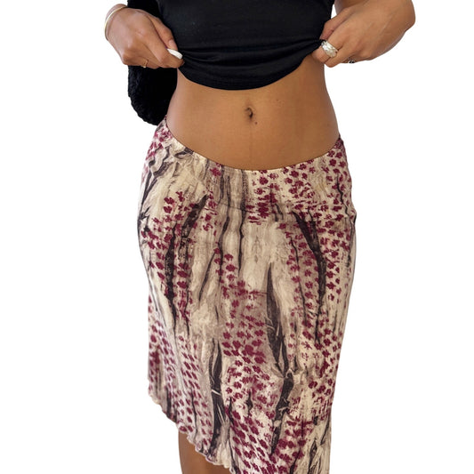 Vintage Italian Abstract Floral Mesh Midi Skirt Beige Burgundy Sheer Hem (S)