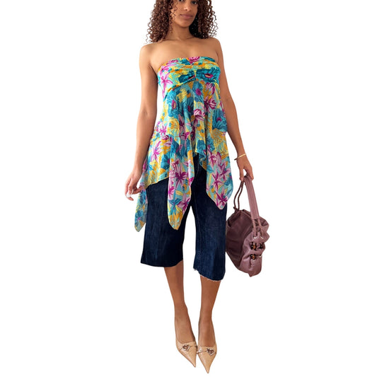 Vintage Italian Tropical Floral Mesh Maxi Skirt Green Pink Y2K (S)