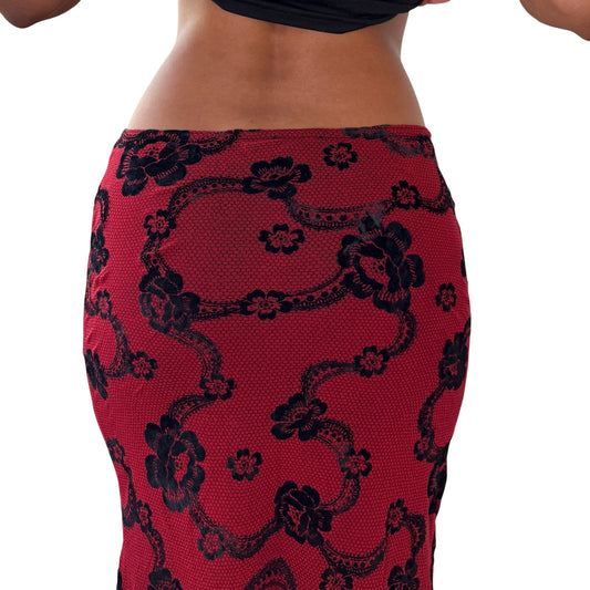 Vintage red black mesh floral midi skirt double lined sheer overlay Y2K France (S)