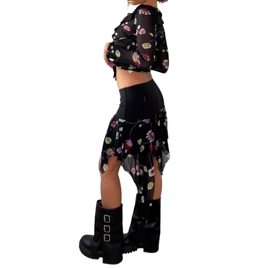 Vintage Y2K Italian Mesh Floral Two-Piece Set Black Top & Handkerchief Skirt (S)