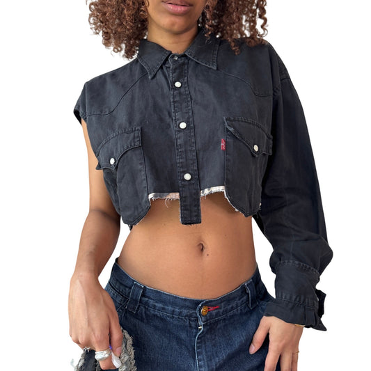 Vintage black denim cropped shirt asymmetrical snap button distressed hem Y2K (S)