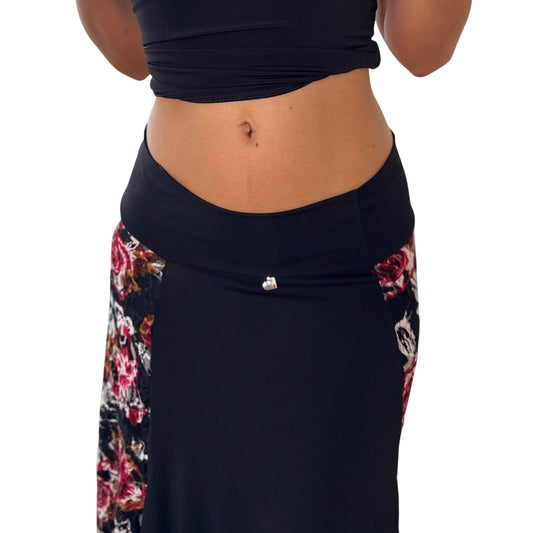 Vintage Italian Black Slinky Midi Skirt Floral Lace Side Panels Fitted (S)
