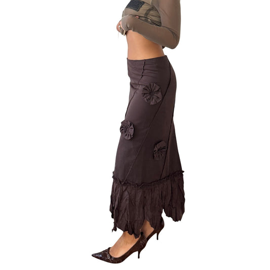 Vintage French brown asymmetric maxi skirt with rosette appliqués and ruffled hem (XS/S)