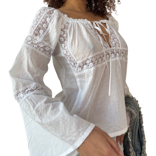 Vintage white cotton lace peasant blouse tie front sheer panels Y2K (S)