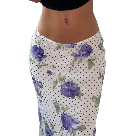 Vintage White Floral Polka Dot Mesh Midi Skirt Purple Rose Y2K French 100% Viscose (S)