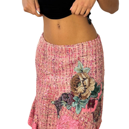 Vintage Italian pink textured tweed midi skirt with floral applique lace hem (S)