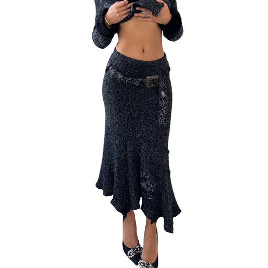 Vintage Italian black wool blend swirl knit skirt set with fuzzy trim (S)