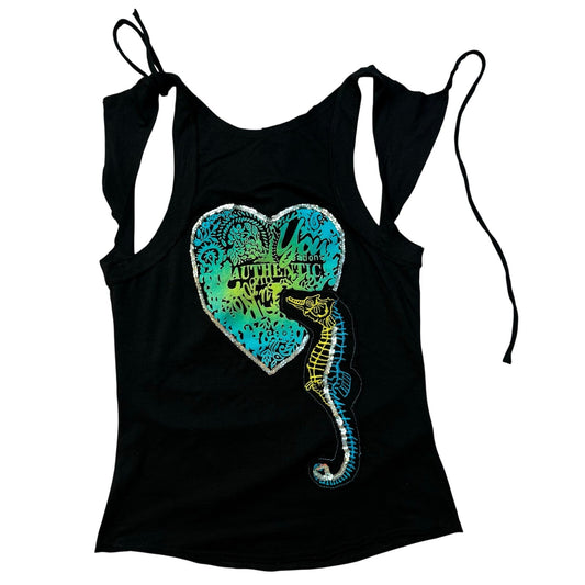 Vintage Italian Y2K Open Back Tank with Embroidered Seahorse & Sequin Detail (S)
