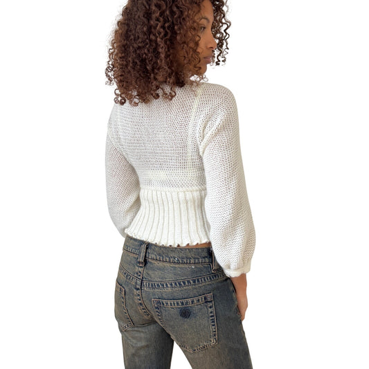 Vintage euro black textured knit tie front cardigan with ruffle trim and flared sleeves (S/M)