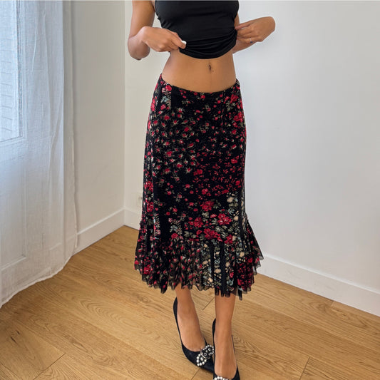 Vintage Italian Black Red Floral Mesh Midi Skirt with Tiered Ruffle Hem (S)