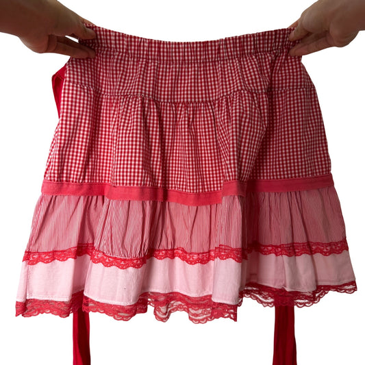 Vintage euro 90s red gingham tiered mini skirt with lace trim ribbon tie waist and layered hem (XS/S)