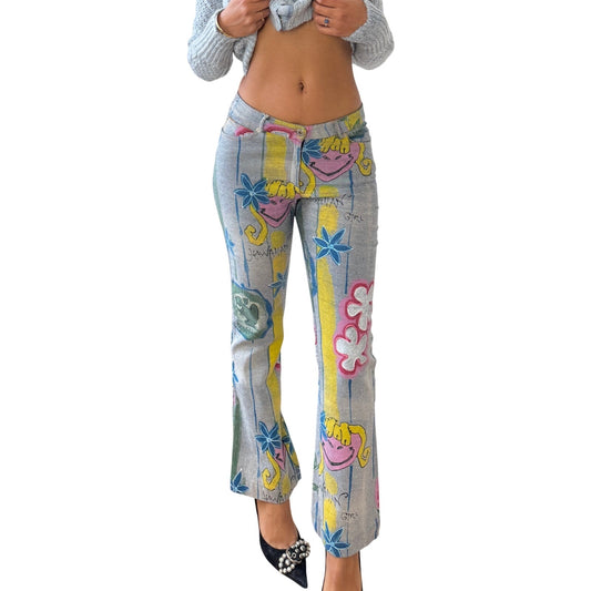 Vintage Italian hand painted style graphic stretch denim pants with colorful abstract motifs (S)