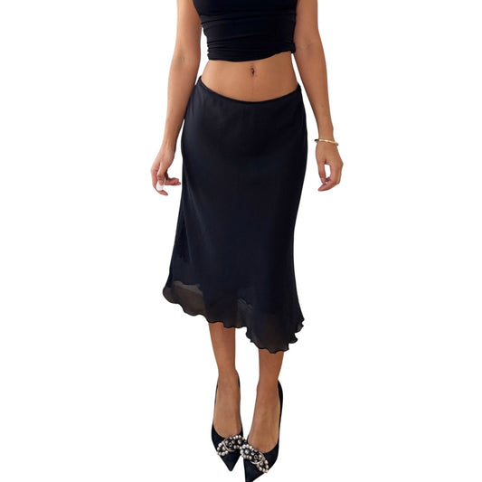 Vintage Italian Black Mesh Midi Skirt Sheer Layered Ruffle Hem Viscose (S)