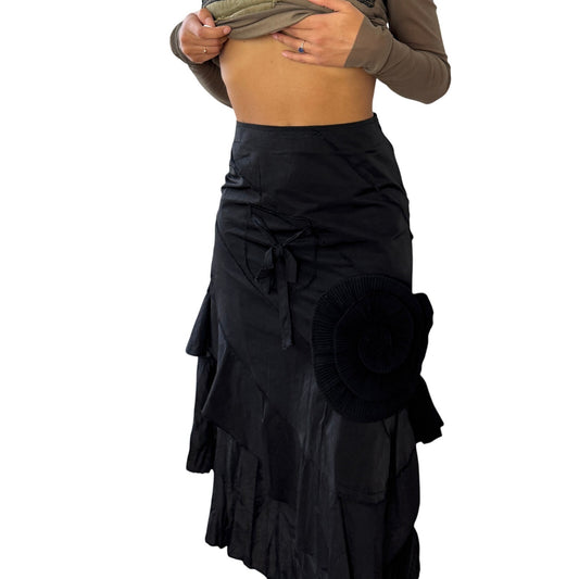 Vintage French black asymmetric tiered midi skirt with sculpted circular appliqué and ruffle panels (XS)