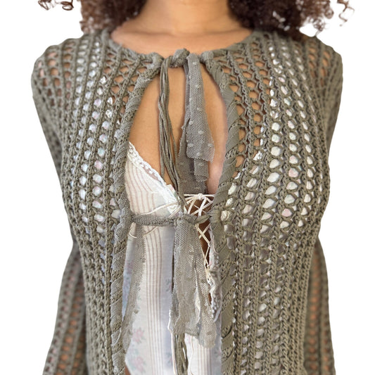 Vintage Italian olive open knit tie front cardigan with long sleeves (S)
