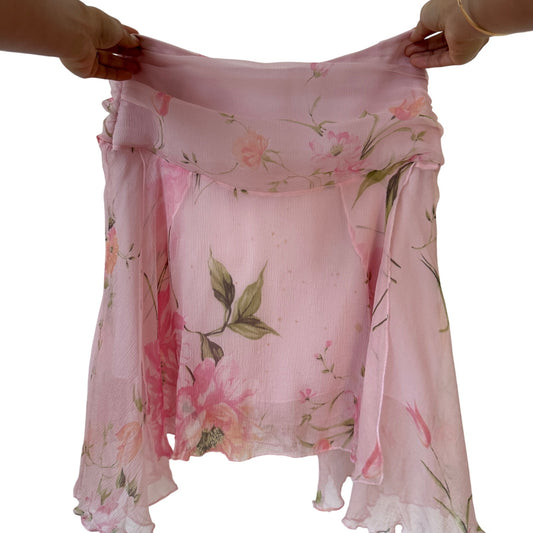 Italian vintage pink silk floral mesh overlay skirt with asymmetric hem (S)