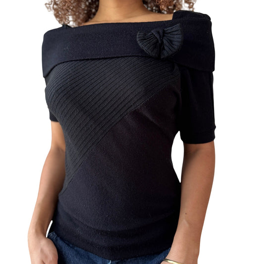 Vintage Black Knit Top Off Shoulder Bow Detail Fitted Short Sleeve (S)