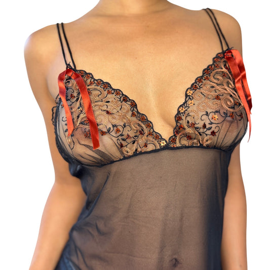 Vintage Italian Sheer Black & Orange Babydoll Top (M)
