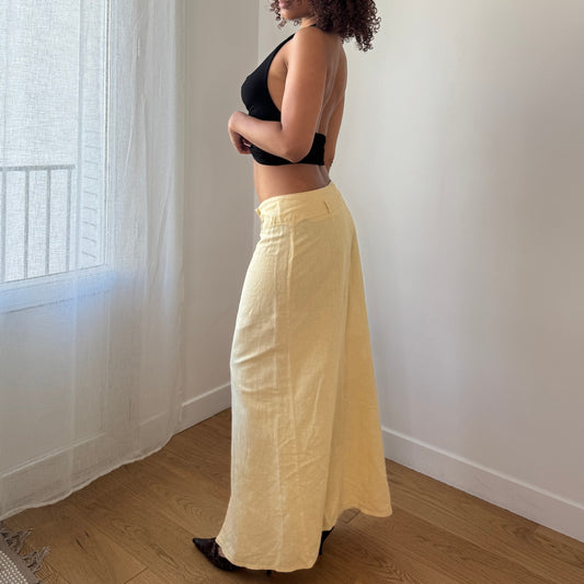 Vintage Italian Linen Blend Maxi Skirt Soft Yellow Front Slit Minimal (XS/S)