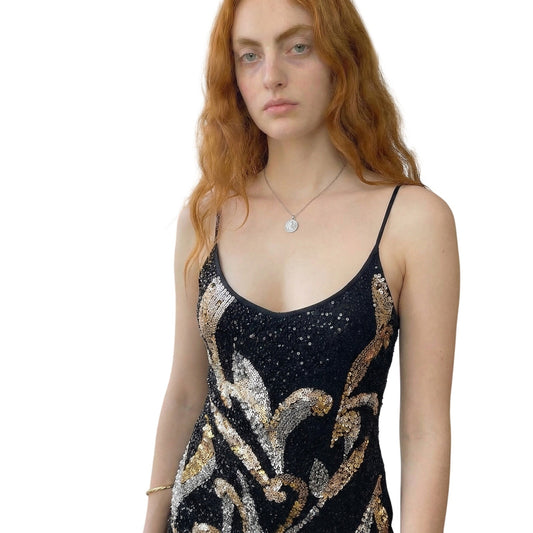 Italian Vintage 00s black & gold sequin midi dress with lace up back (S) party