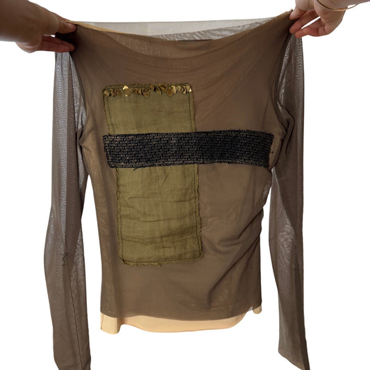 Vintage Italian Sheer Layered Mesh Top with Olive Patchwork Panel and Metallic Sequin Detail (S)