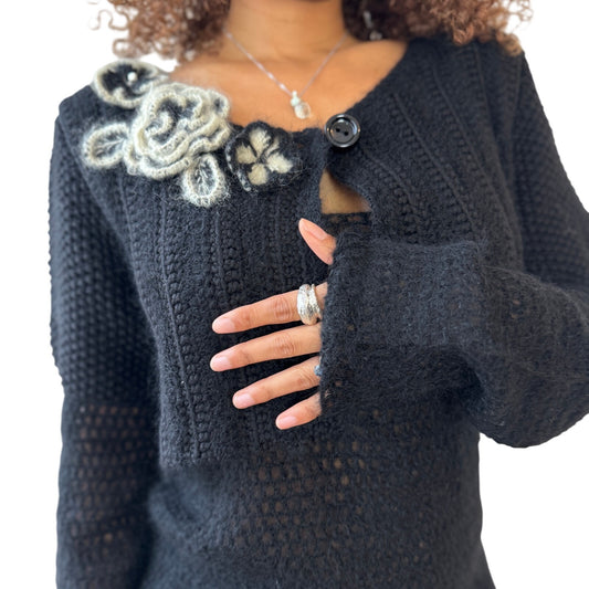Italian Vintage black wool-appliqué flounce midi skirt (S)