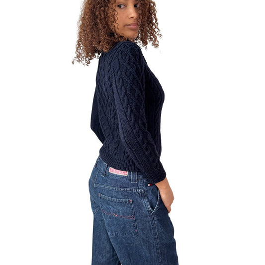 Vintage Italian Navy Cable Knit Half Zip Sweater High Neck Wool Blend (S)