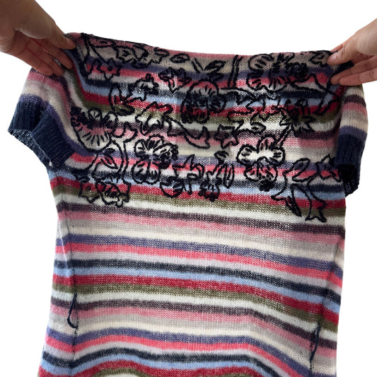 Vintage Pepe Jeans striped mohair-blend short-sleeve cardigan with floral detailing (Small)