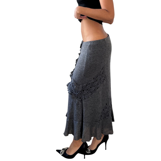 Vintage Italian Grey Mohair Blend Knit Midi Skirt Crochet Panel Ruffle Hem (S/M)