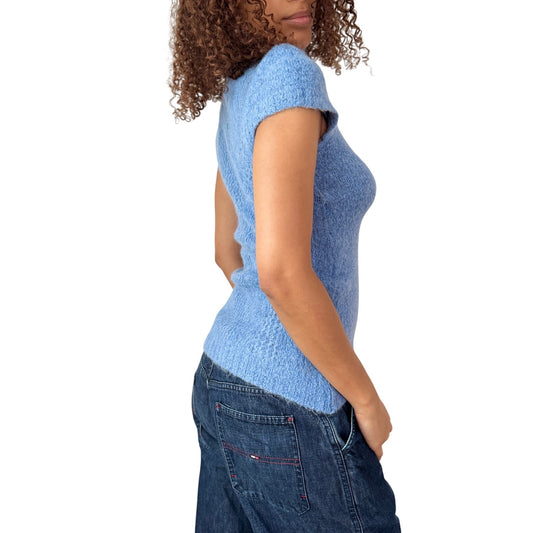 Vintage Italian Blue Mohair Wool Blend Cap Sleeves Turtleneck Knit Top (S/M)