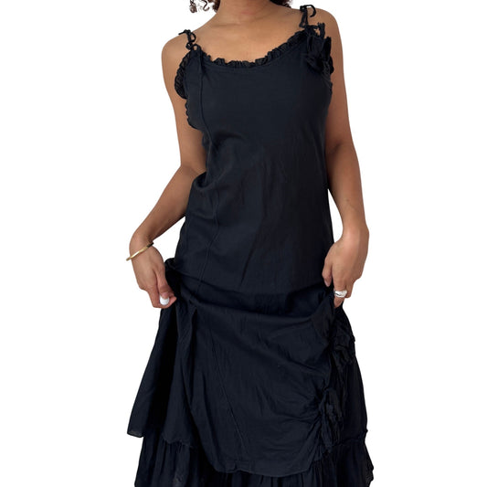 Vintage Black Maxi Dress Ruffle Neckline Adjustable Tie Straps Y2K Italian Cotton (S)