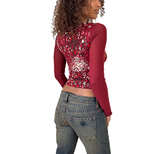 Vintage Euro Y2K Red Burgundy Geometric Mesh Long Sleeve Top (Small)
