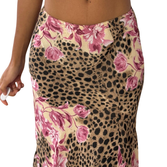 Vintage Euro leopard & pink rose floral printed stretch midi skirt (Small)