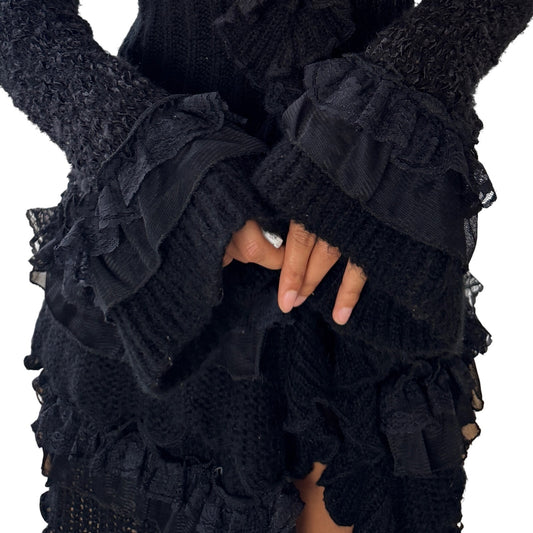 Vintage Euro black ruffled knit maxi cardigan dress with button front (M)
