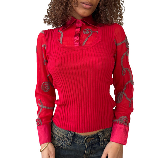 Vintage Italian red mixed fabric long sleeve top with ribbed knit body mesh swirl sleeves and satin collar detail (S)