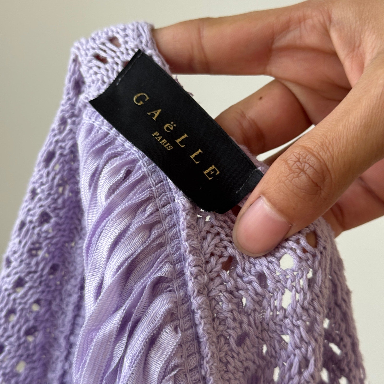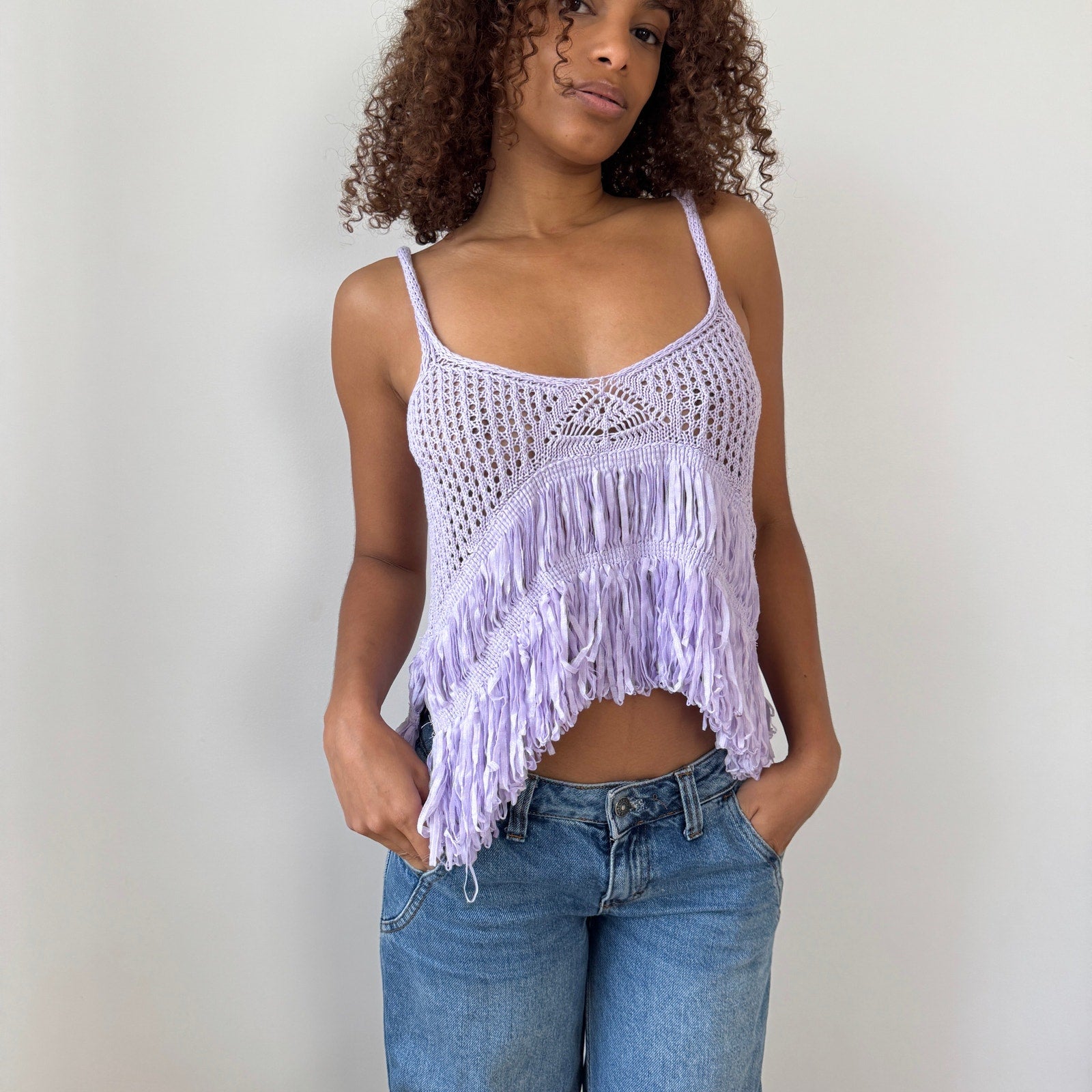 Whimsical lavender knit cami featuring an airy open-weave bodice, hand-tied fringe detailing, and a beautifully draped hem that gives it that carefree boho–Y2K feel. Made in Italy for a French label, this piece has that dreamy cottagecore energy while still being super wearable and lightweight.
