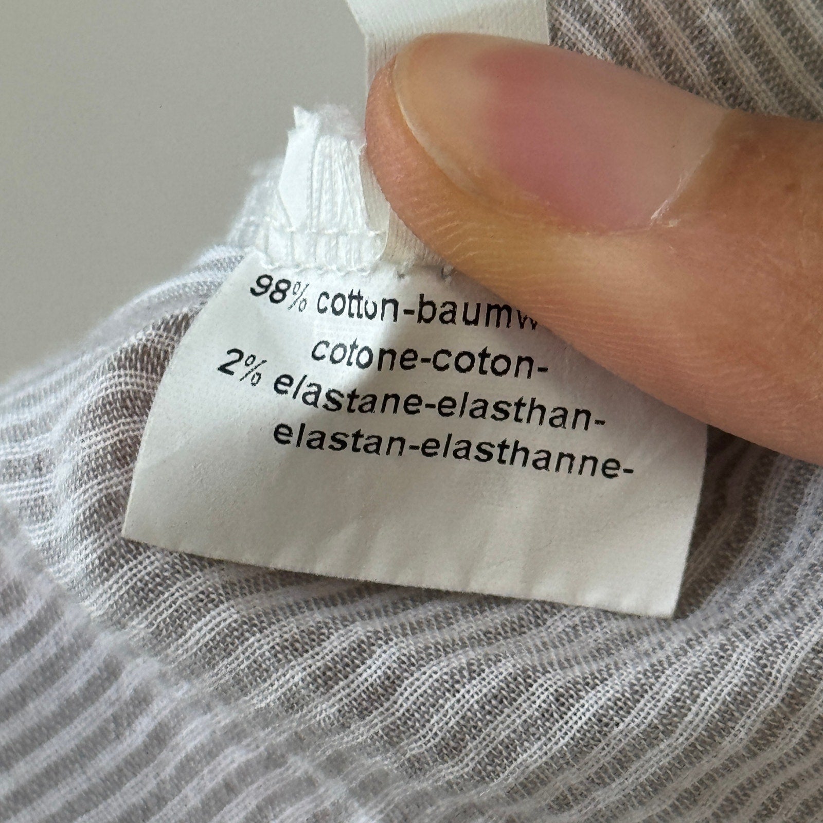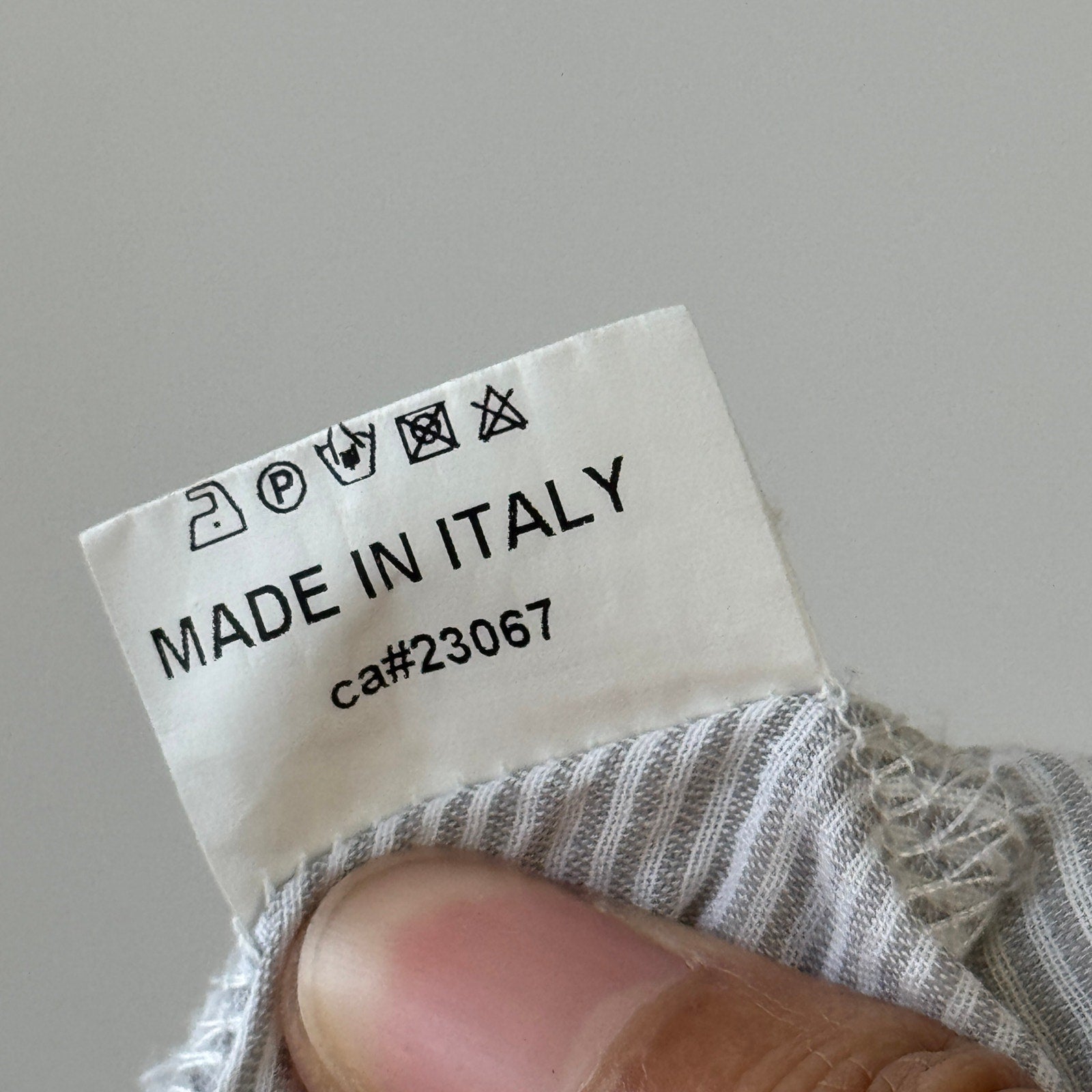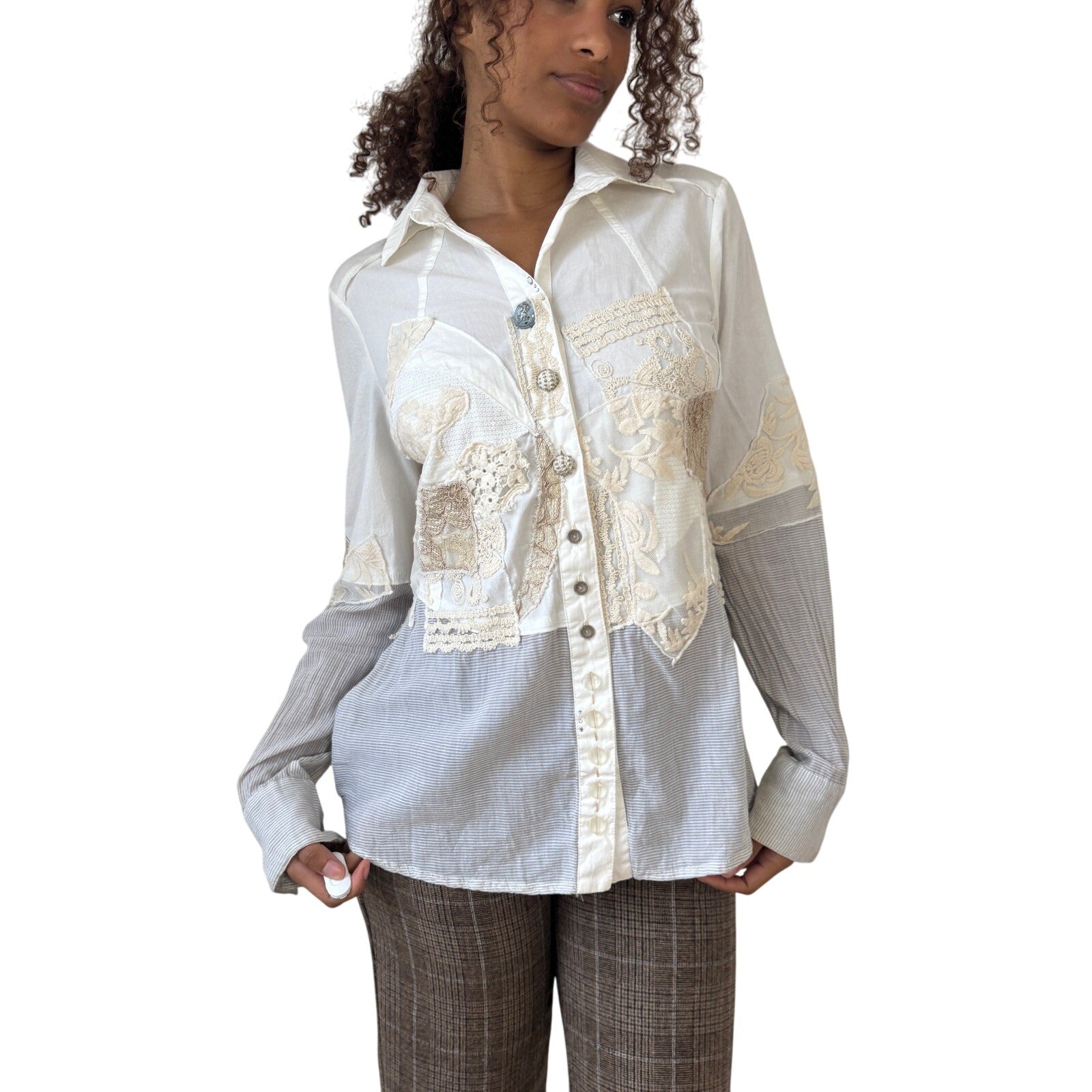 One-of-a-kind vintage Italian button-down blouse featuring intricate cream lace appliqués, mixed-texture patchwork panels, and unique artisan buttons down the front. Striped panels blend for a dimensional, deconstructed look. Softly structured silhouette with a romantic, heirloom feel. True European vintage. Free shipping on bundles <3