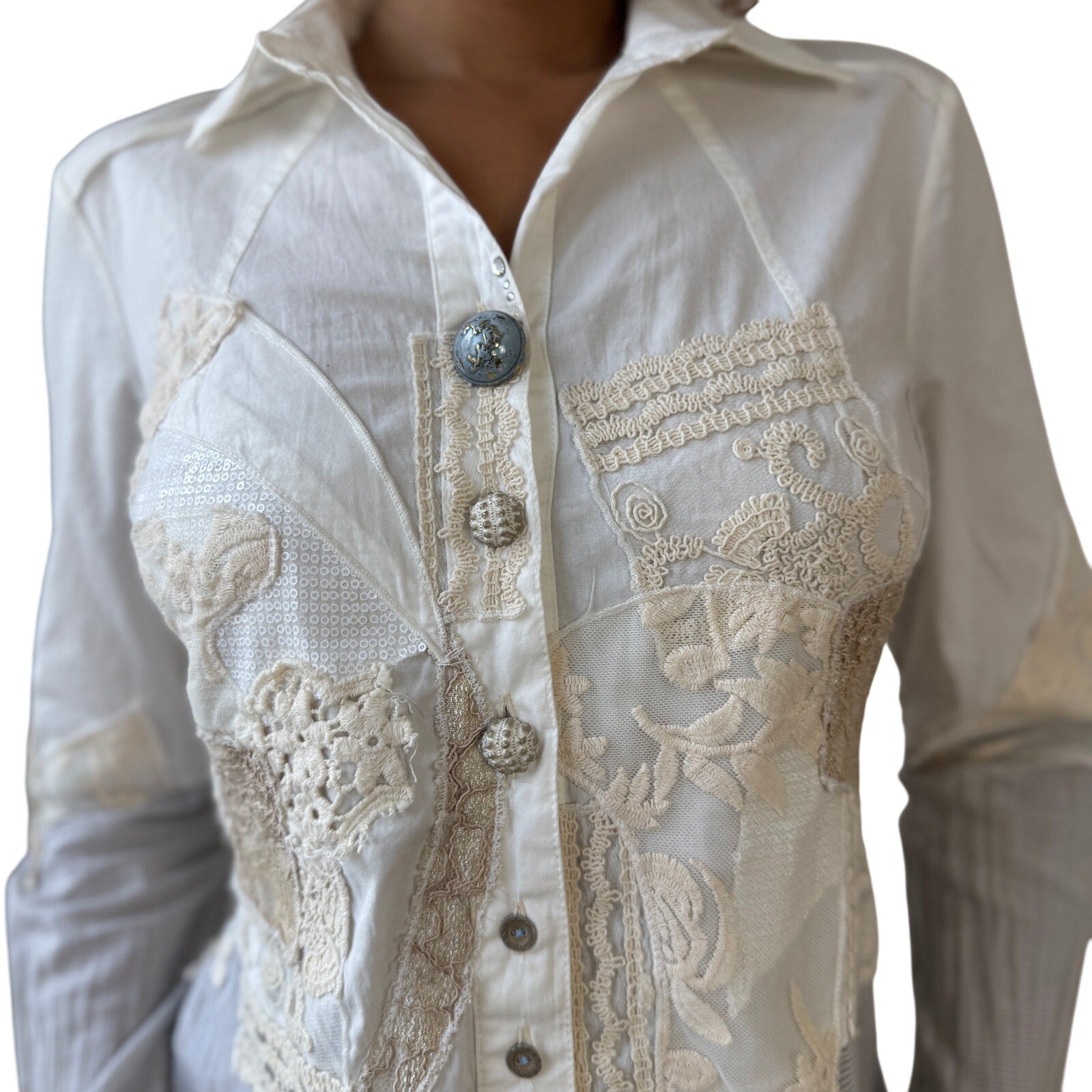 Vintage Italian patchwork lace & cotton appliqué button-down blouse (Medium)