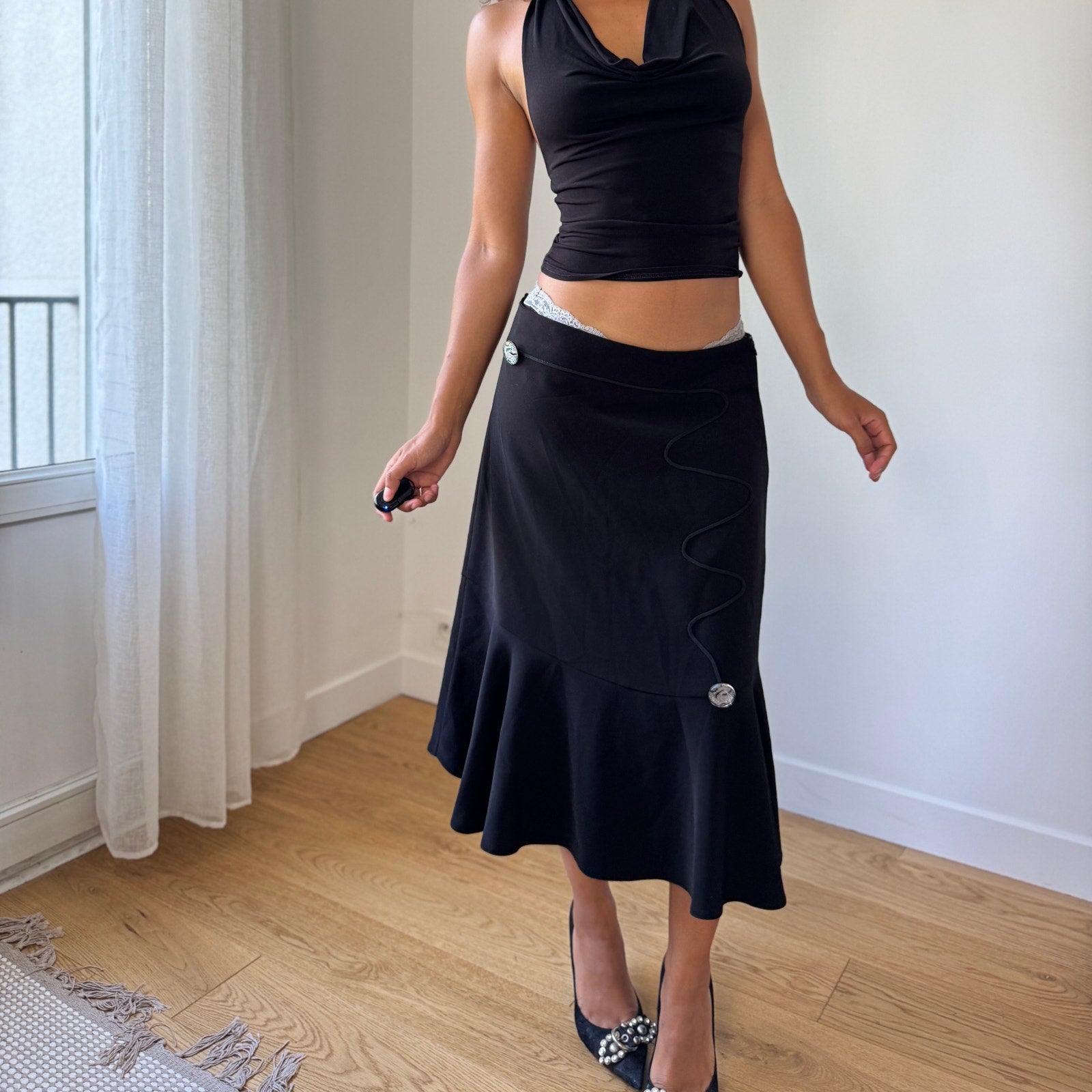 Sleek black midi skirt with sculptural seamwork, wavy piped detail, and a flippy flounce hem. Silver-tone button accents and a clean zipper closure.
