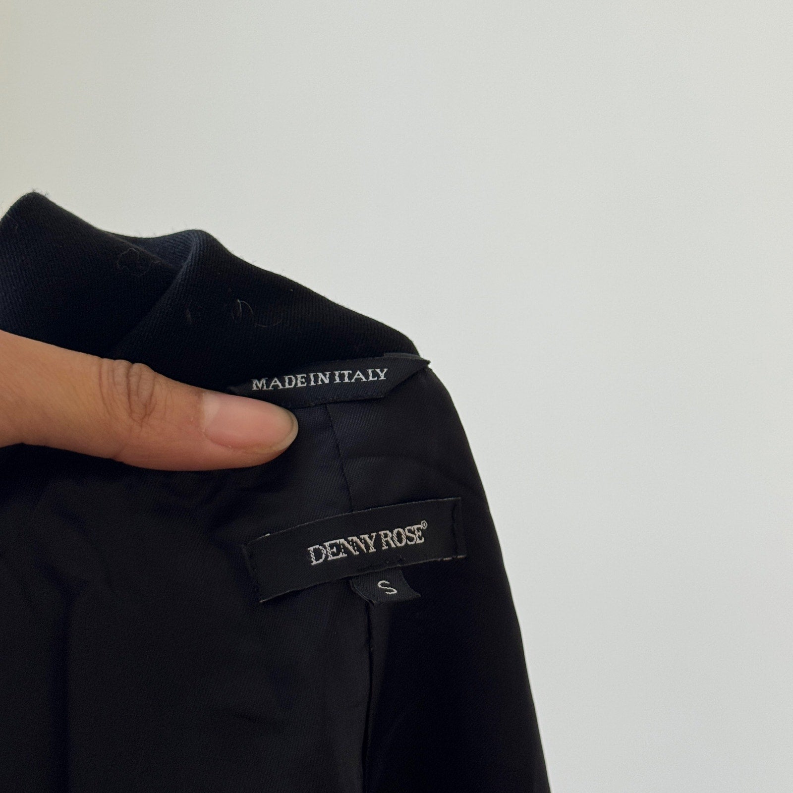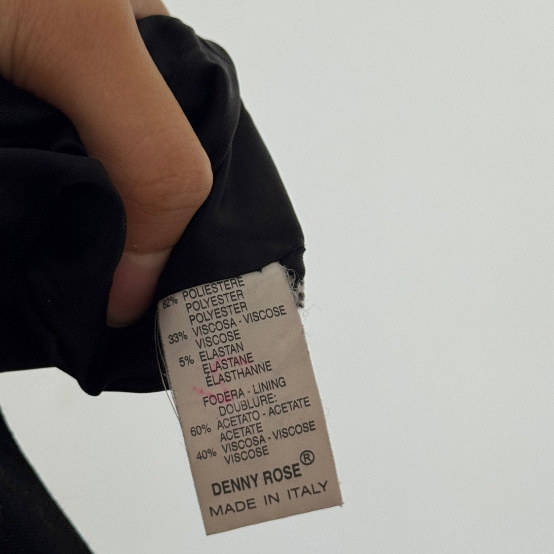 - Back is fully embellished with rhinestone “Denny Rose” lettering and a large cross motif with metallic ring detail