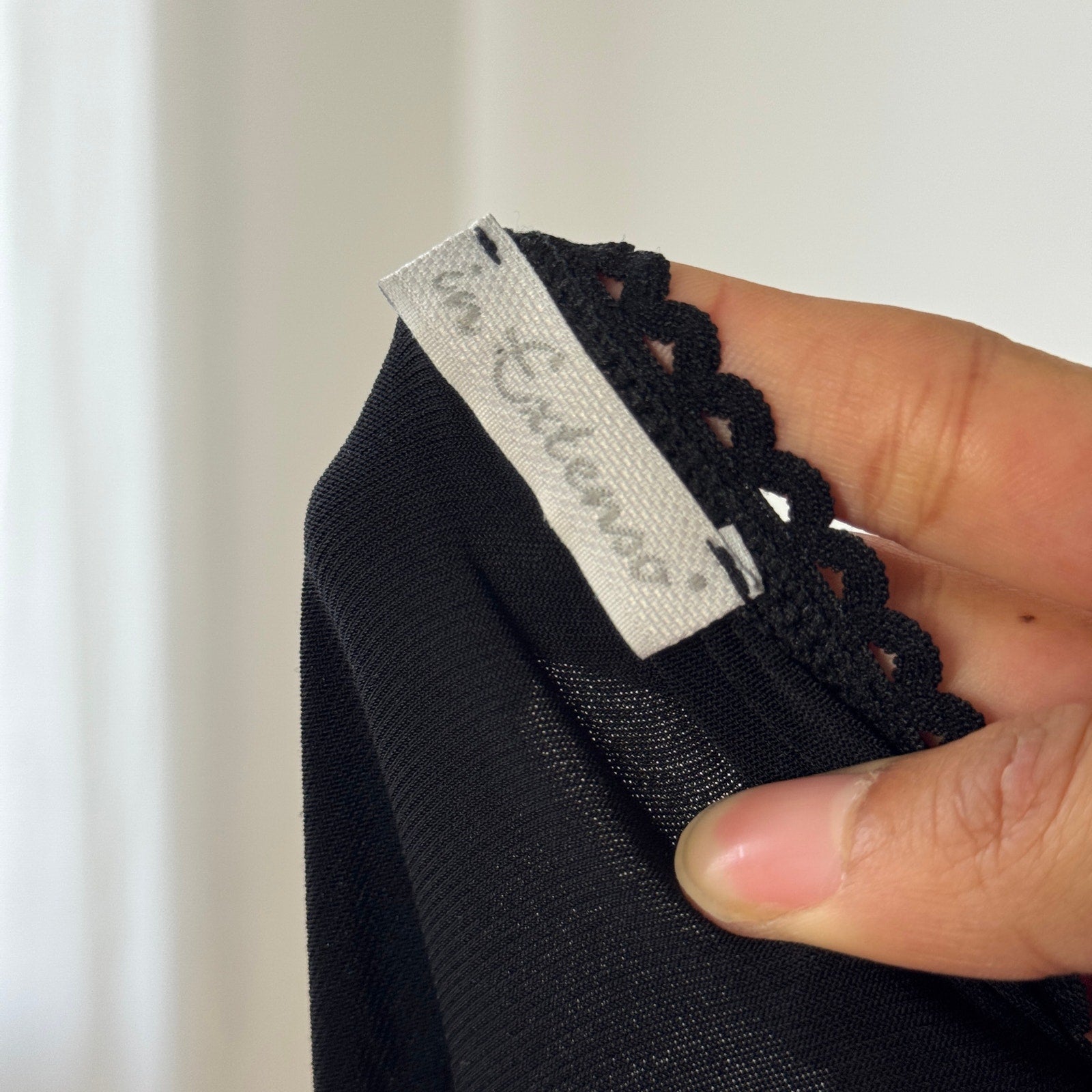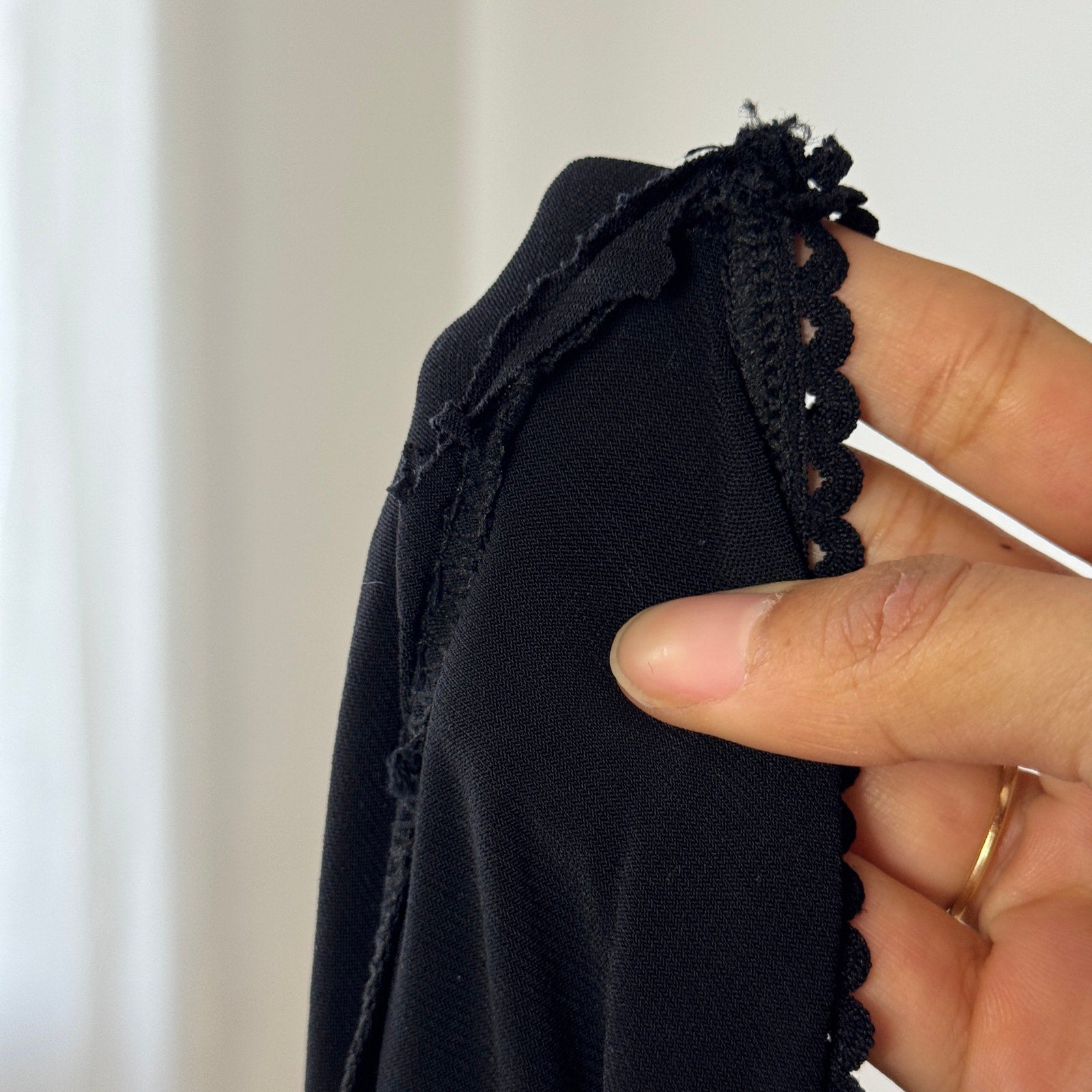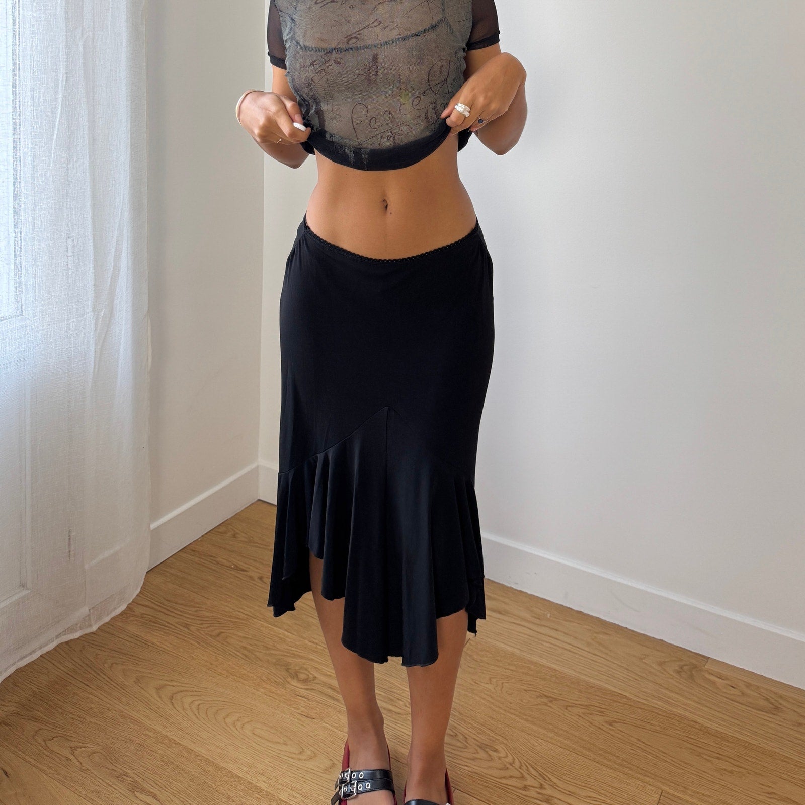 Vintage Euro black asymmetric ruffle-hem stretch midi skirt (Small)