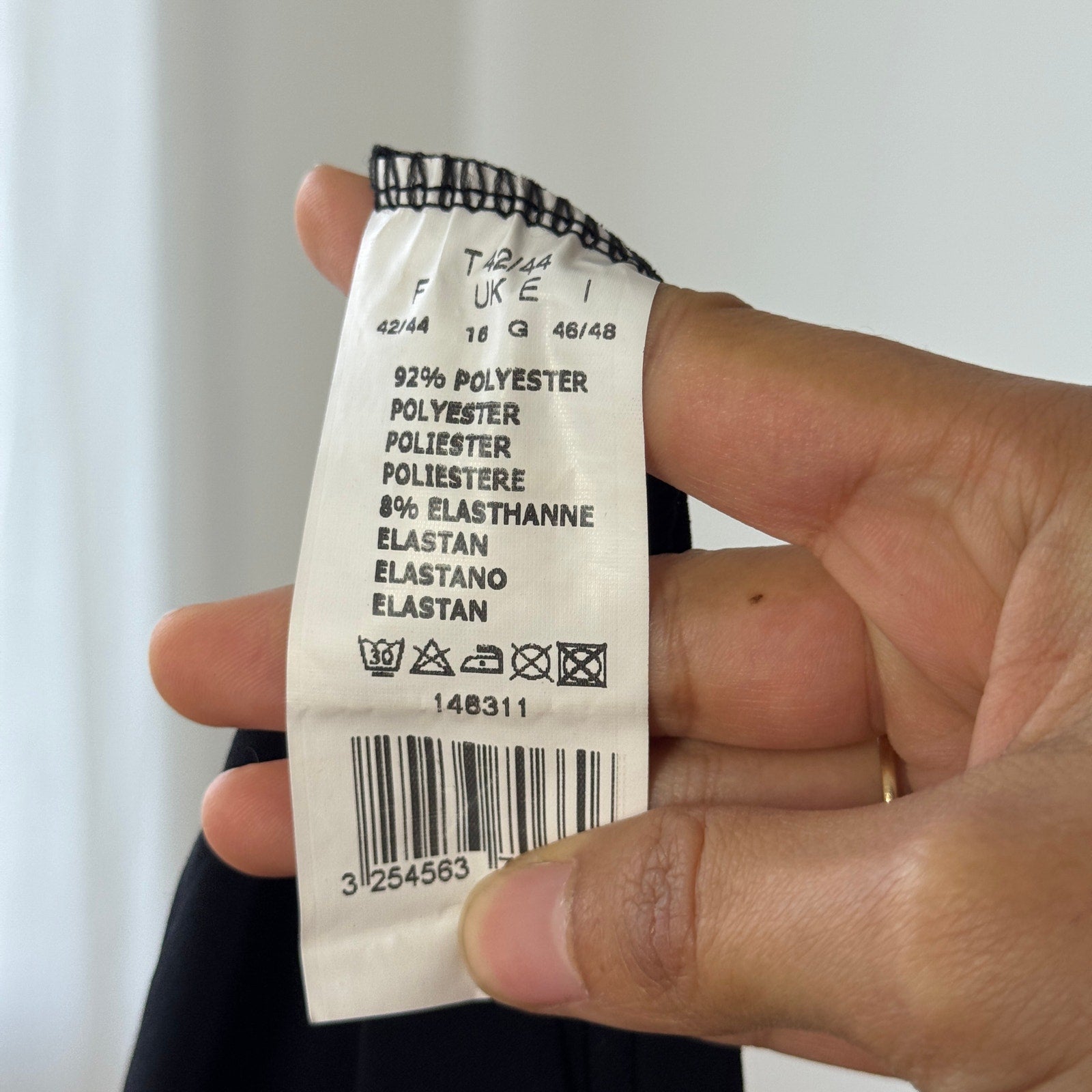 Soft stretchy slinky with a smooth finish; mid-rise fit with diagonal seam detailing and a flared asymmetric ruffle hem for movement. Lightweight, unlined, and comfortably form-skimming with good stretch. Euro vintage.