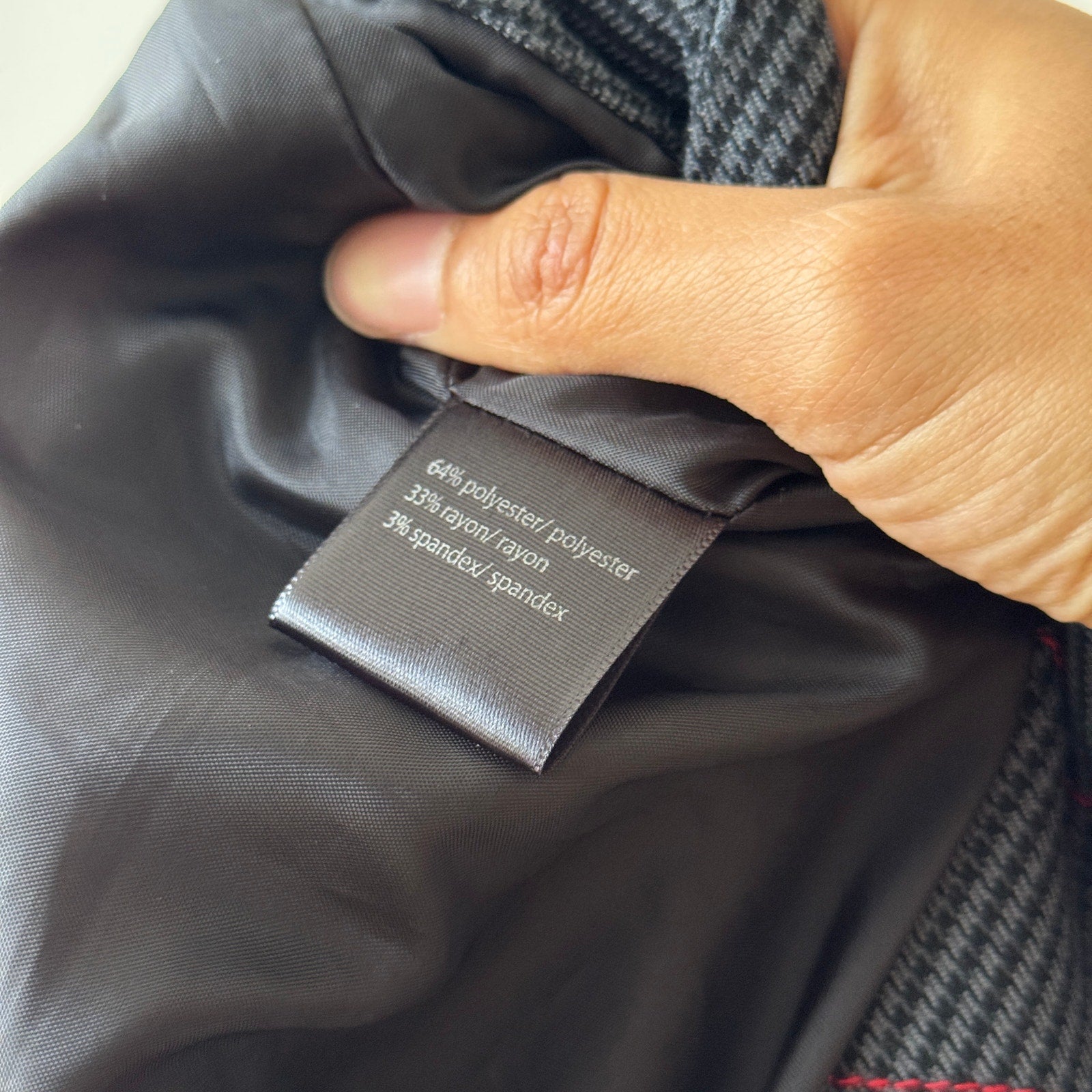 Structured woven fabric with contrast red stitching; full front metal zipper closure with dual pulls, flap pocket detailing at the hips, and voluminous gathered bubble-style panels at the sides. Euro vintage.