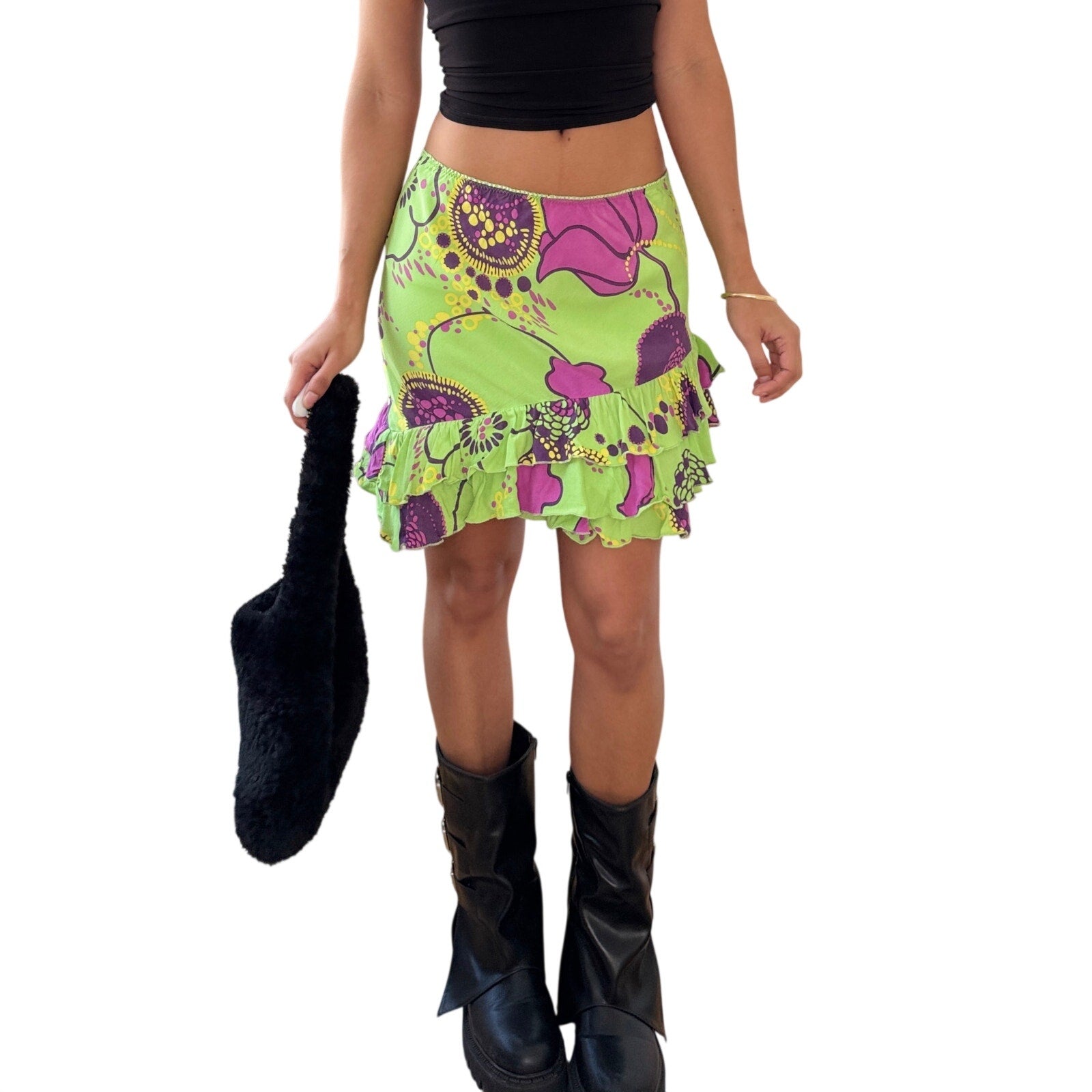 Italian vintage mini skirt crafted from lightweight mesh with double lining, featuring a vibrant green base with bold floral print in purple and yellow tones. Flowy silhouette with layered ruffle hem for a playful Y2K look. Stretchy and comfortable fit. Made in Italy.