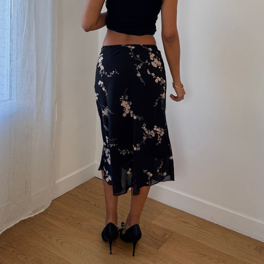 Vintage Italian Y2K Black Floral Low Rise Mesh Midi Skirt (S/M)