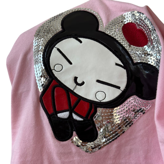 Vintage Euro black + pink mesh-knit ruffle-sleeve top (S)