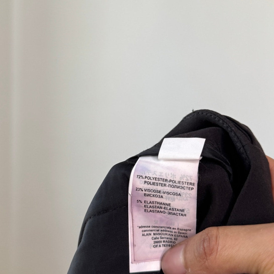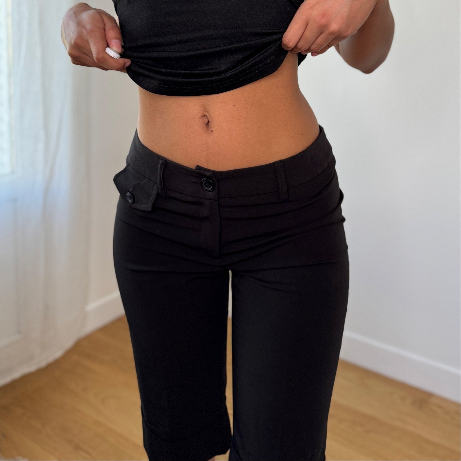 Vintage French capri shorts in polyester and viscose blend. Black with decorative button detailing along waistband and back pockets, cuffed hem, low-rise fit, zip closure. Fabric is smooth and structured with minimal stretch. Free shipping on bundles <3