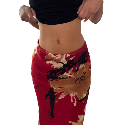 Vintage Red Abstract Print Mesh Midi Skirt Asymmetric Y2K Italian (S)