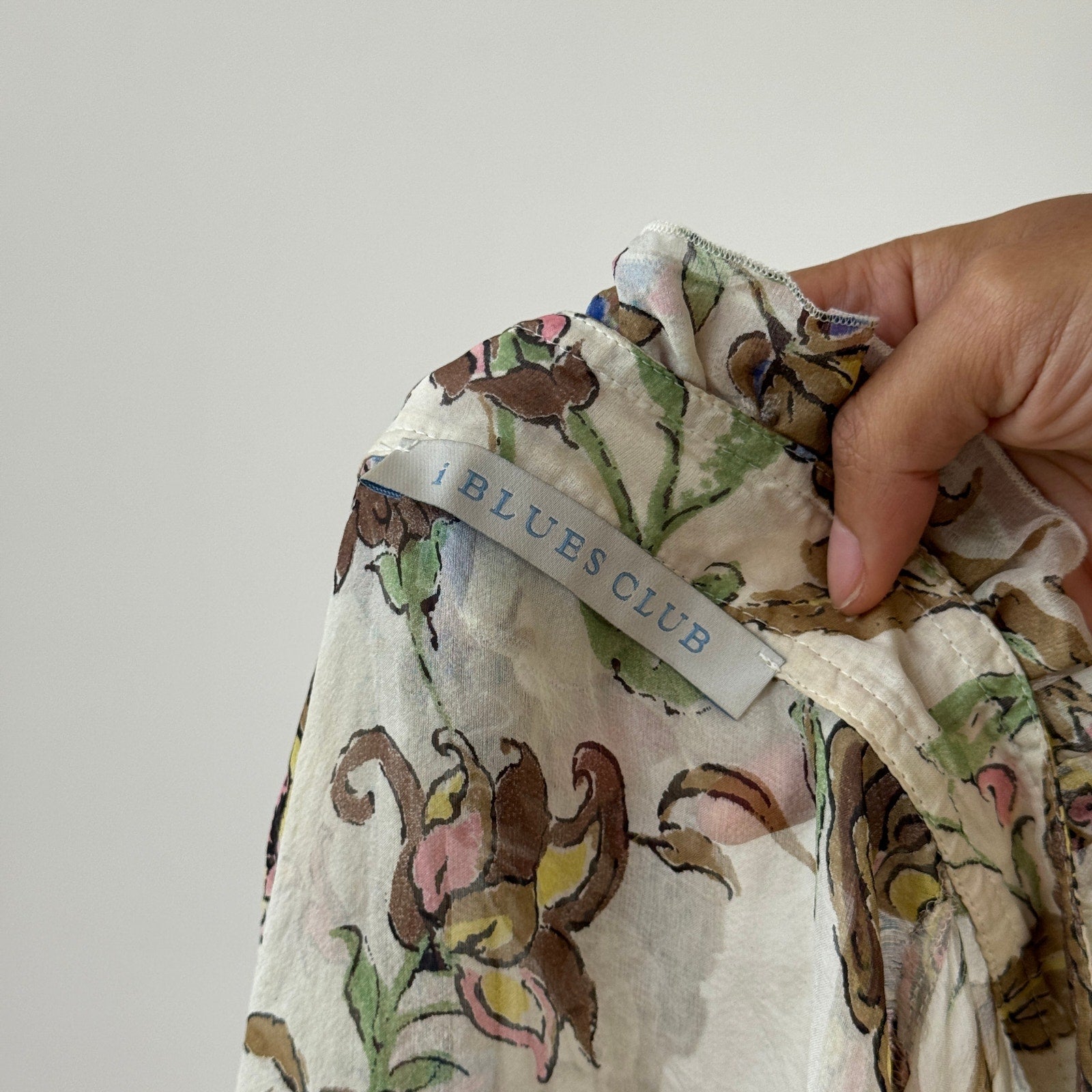 Vintage Italian Sheer Mesh Ruffle-Neck Floral Tunic Top (M/L)